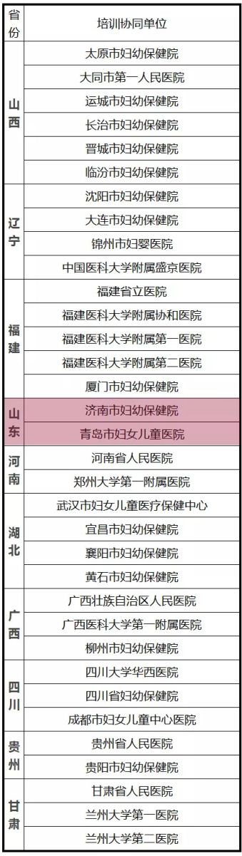 為加強(qiáng)和規(guī)范出生缺陷防治人才培訓(xùn)、提升出生缺陷防治能力和水平,國家衛(wèi)生健康委婦幼司近日在山西、遼寧、浙江、福建、 山東 、河南、湖北、湖南、廣西、四川、貴州、甘肅12個?。▍^(qū))啟動實施“全國出生缺陷防治人才培訓(xùn)項目”并核準(zhǔn)公布了14家醫(yī)療機(jī)構(gòu)為首批培訓(xùn)基地、34家醫(yī)療機(jī)構(gòu)為首批培訓(xùn)協(xié)同單位,我省3家醫(yī)院“上榜”。 山東省婦幼保健院入圍首批培訓(xùn)基地,濟(jì)南市婦幼保健院、青島市婦女兒童醫(yī)院入圍首批培訓(xùn)協(xié)同單位。