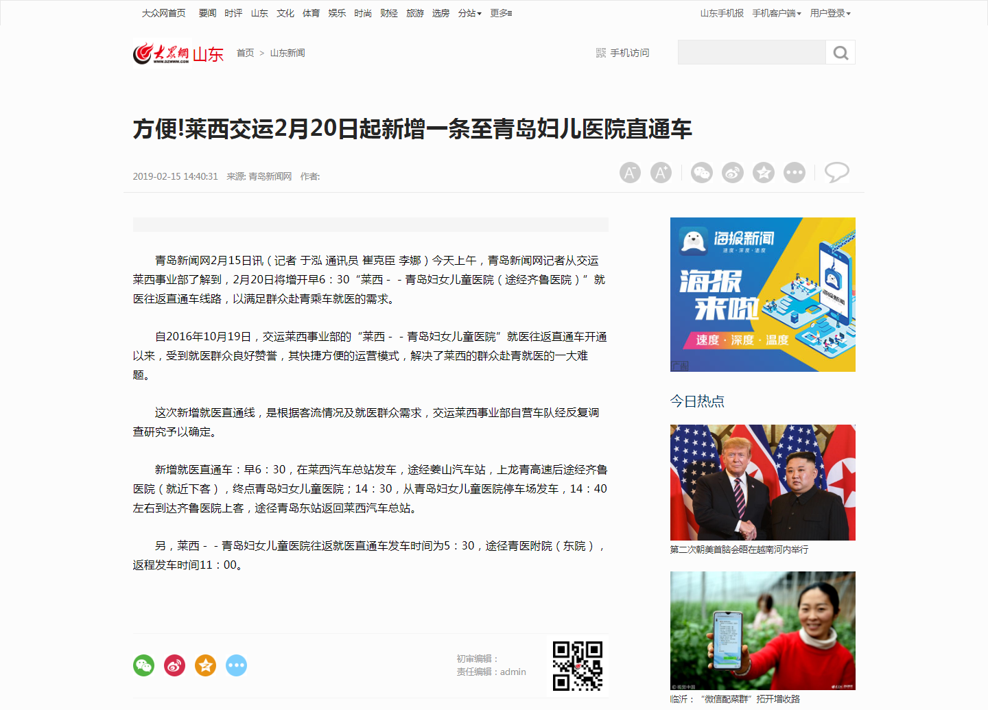 大眾網(wǎng):方便!萊西交運2月20日起新增一條至青島婦兒醫(yī)院直通車