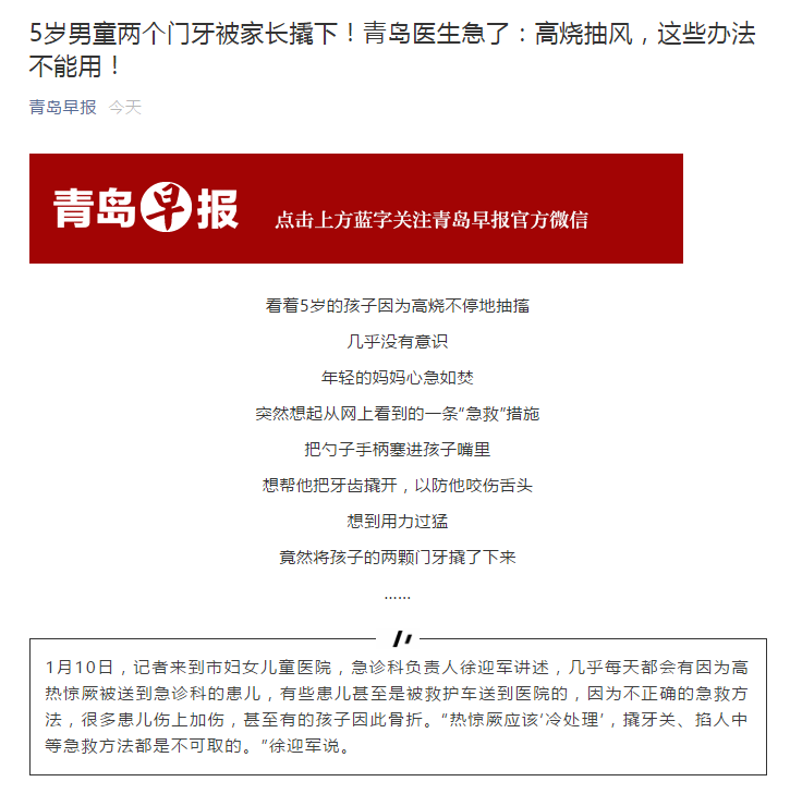 青島早報:5歲男童兩個門牙被家長撬下!青島醫(yī)生急了:高燒抽風(fēng),這些辦法不能用!