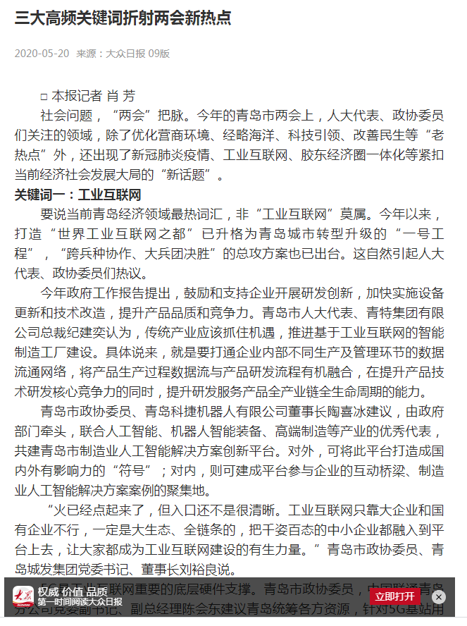 要說當(dāng)前青島經(jīng)濟(jì)領(lǐng)域最熱詞匯,非“工業(yè)互聯(lián)網(wǎng)”莫屬。今年以來,打造“世界工業(yè)互聯(lián)網(wǎng)之都”已升格為青島城市轉(zhuǎn)型升級(jí)的“一號(hào)工程”,“跨兵種協(xié)作、大兵團(tuán)決勝”的總攻方案也已出臺(tái)。這自然引起人大代表、政協(xié)委員們熱議。