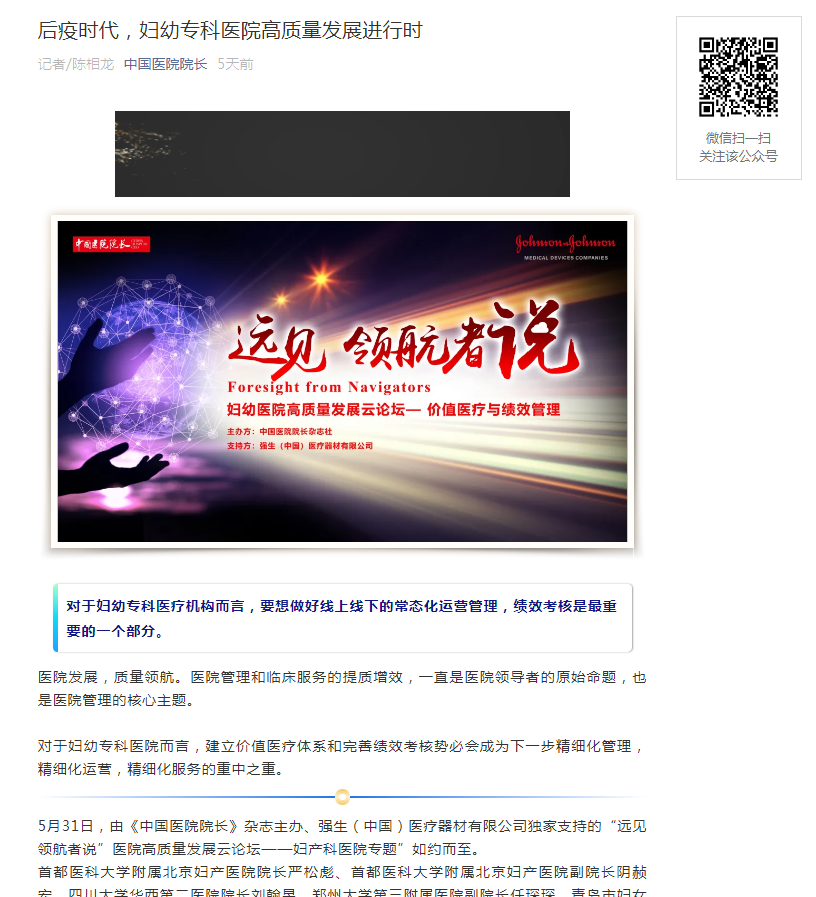 5月31日,由《中國(guó)醫(yī)院院長(zhǎng)》雜志主辦、強(qiáng)生(中國(guó))醫(yī)療器材有限公司獨(dú)家支持的“遠(yuǎn)見(jiàn) 領(lǐng)航者說(shuō)”醫(yī)院高質(zhì)量發(fā)展云論壇——婦產(chǎn)科醫(yī)院專題”如約而至。