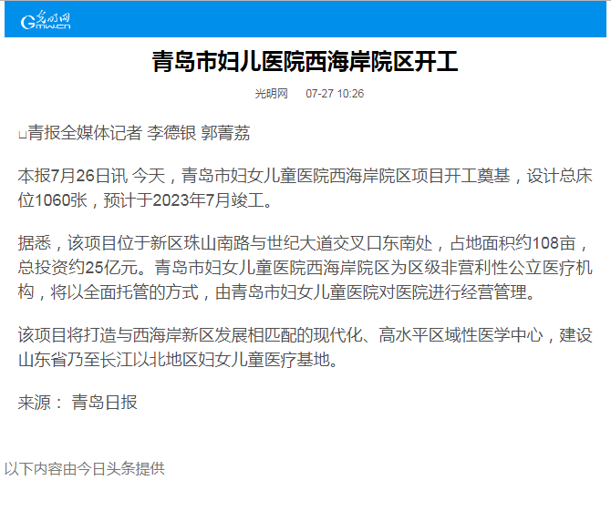 光明網(wǎng):青島市婦兒醫(yī)院西海岸院區(qū)開工