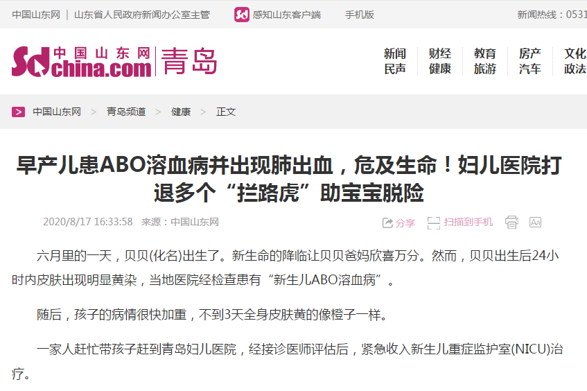 中國山東網(wǎng):早產(chǎn)兒患ABO溶血病并出現(xiàn)肺出血,危及生命!婦兒醫(yī)院打退多個“攔路虎”助寶寶脫險